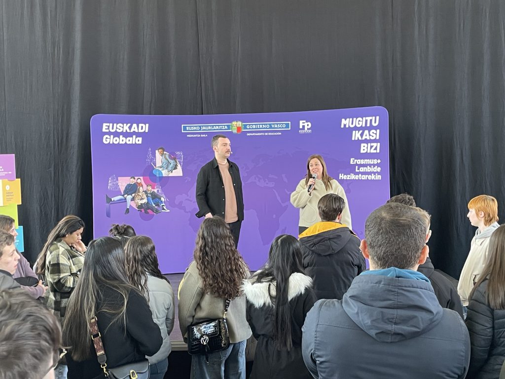 Iaz UNItik Erasmusen joan ziren Enol, Eneko, Adrian, Aner eta Beñatek euren esperientzia kontatu diete Landako Gunean batu diren ikasleei.